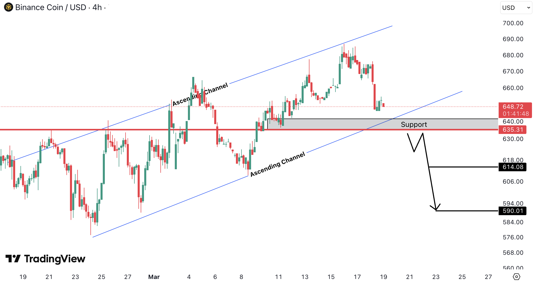 Pe 4H, BNBUSD este intr-un ascending channel si face pullback dupa rejectia din partea superioara.