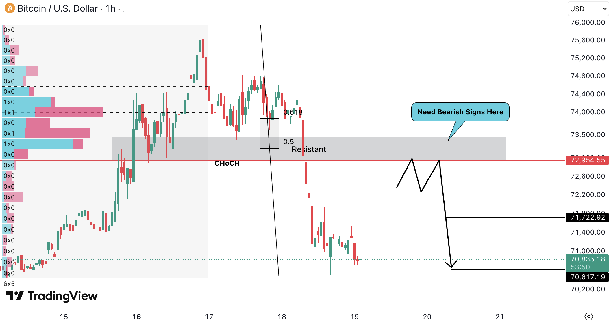 Pe timeframe 1H, BTCUSD a aratat un bearish CHoCH, iar pretul este in jur de 70,835 USD (≈ 65,167.20 EUR).