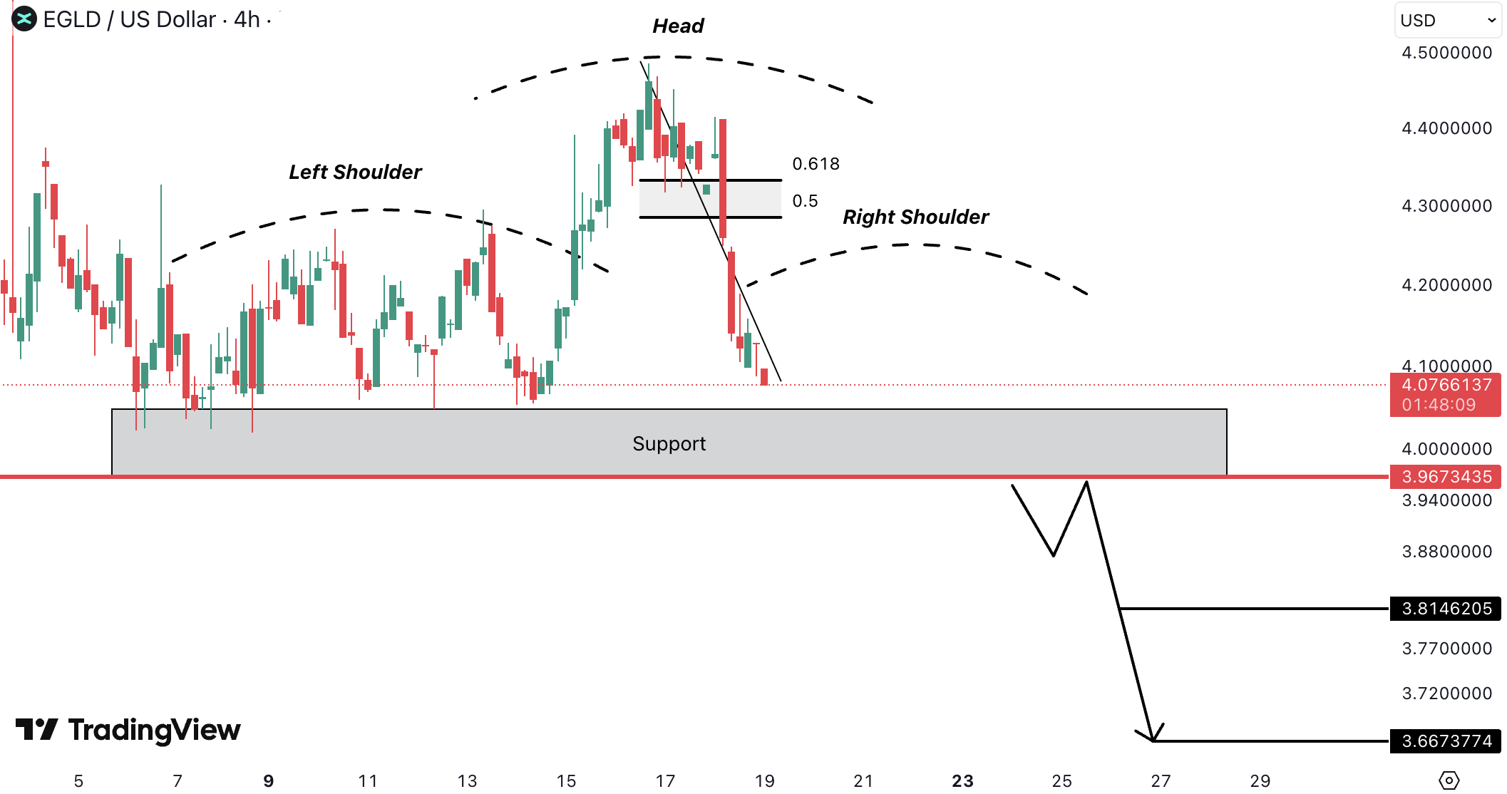 Pe 4H, EGLDUSD formeaza un head and shoulders, cu right shoulder in constructie din zona Fibonacci.