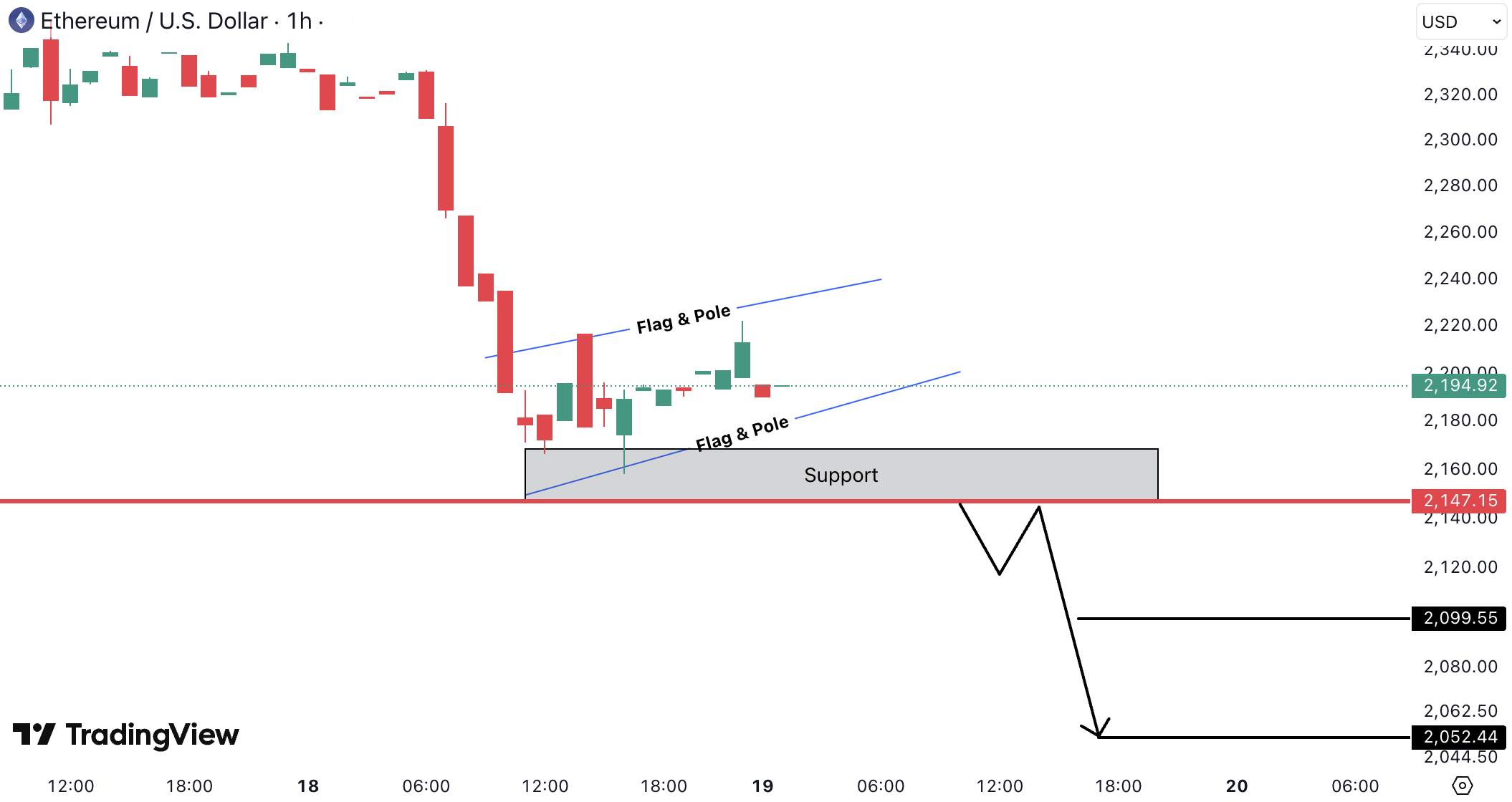 Pe 1H, ETHUSD formeaza un bearish flag & pole dupa un drop impulsiv. Pretul este in jur de 2,194 USD (≈ 2,018.48 EUR), consolidand peste suportul de 2,147 USD (≈ 1,975.24 EUR).