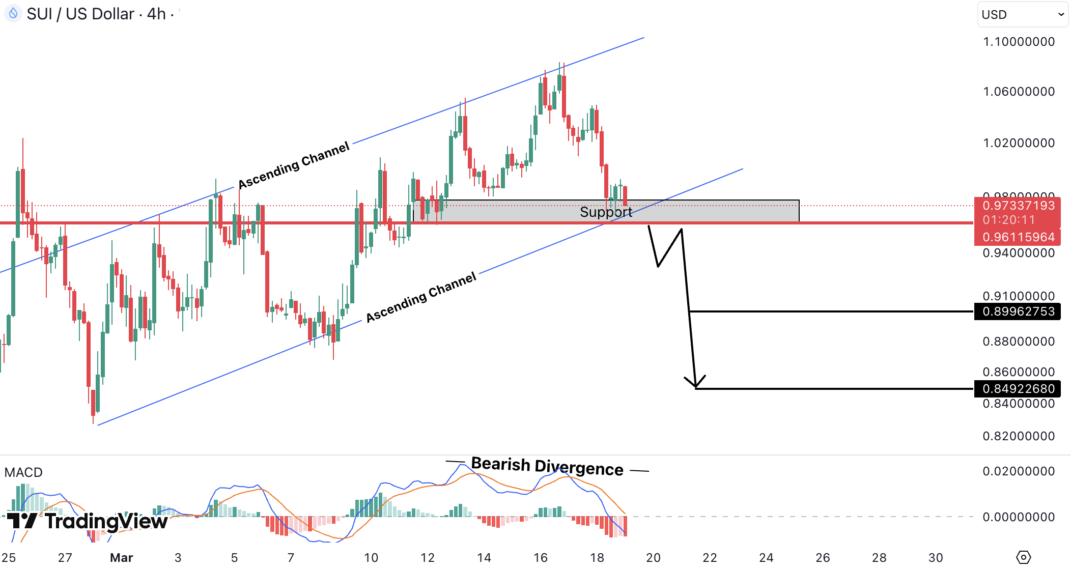 Pe 4H, SUIUSD este in ascending channel, cu bearish divergence pe MACD.