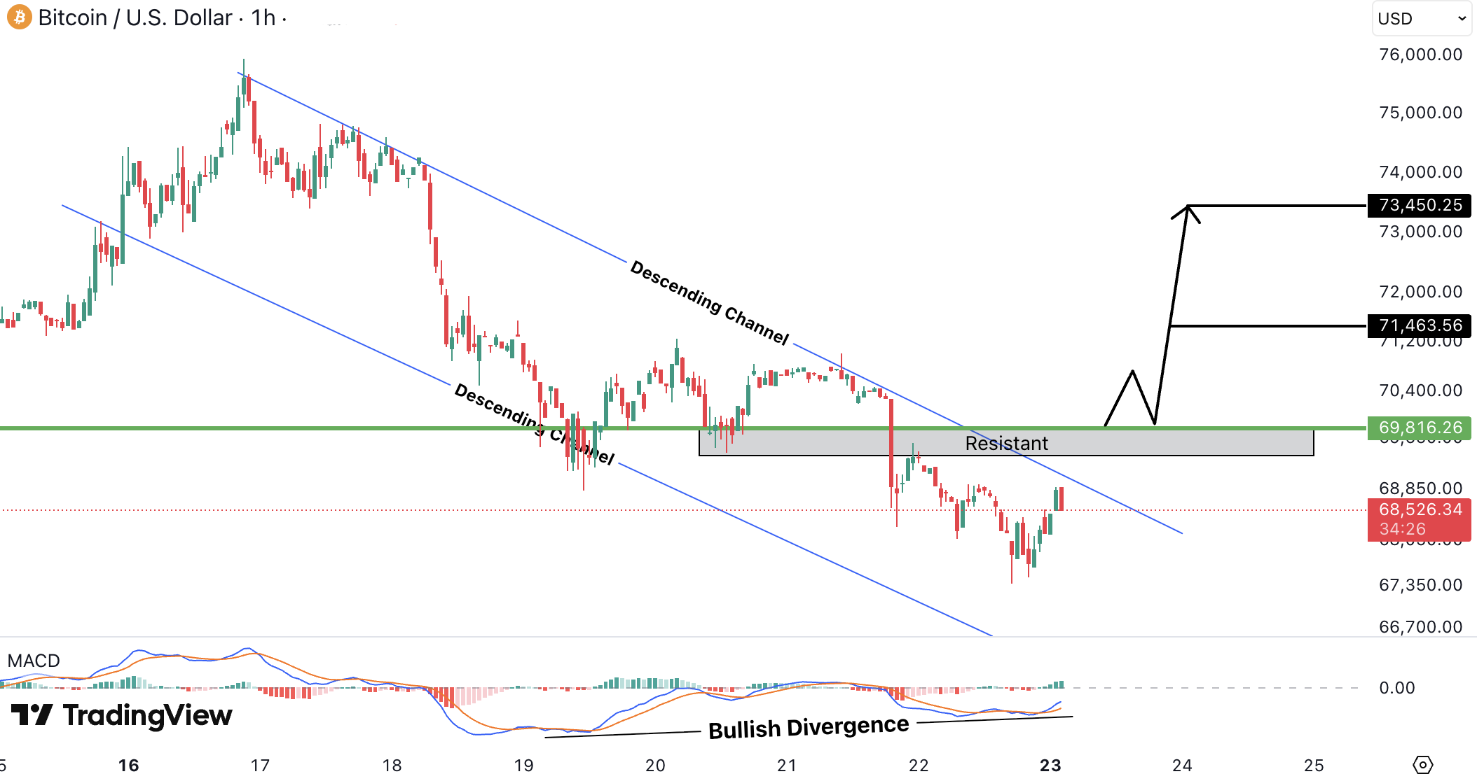 BTCUSD pe timeframe 1H se tranzactioneaza intr-un descending channel, cu bullish divergence clara pe MACD, ceea ce arata ca momentumul bearish slabeste aproape de limita inferioara. Pretul este in jur de 68,500 USD (~63,020 EUR) si se apropie de zona de rezistenta 69,800 USD (~64,220 EUR).
