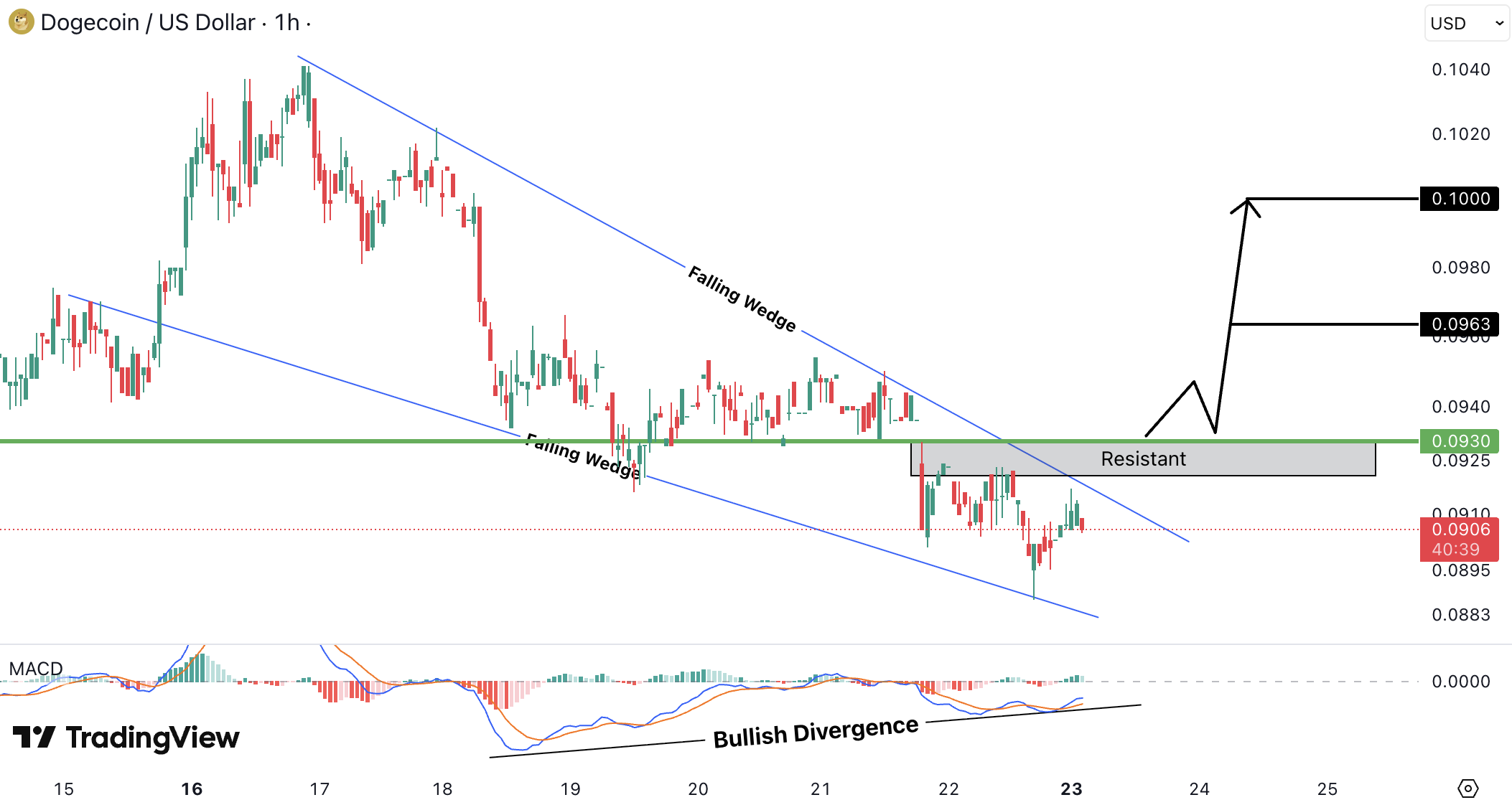 DOGEUSD pe timeframe 1H se comprima intr-un falling wedge, iar bullish divergence pe MACD arata ca presiunea de vanzare slabeste. Pretul este in jur de 0.090 USD (~0.083 EUR) si incearca sa urce spre rezistenta 0.093 USD (~0.086 EUR).