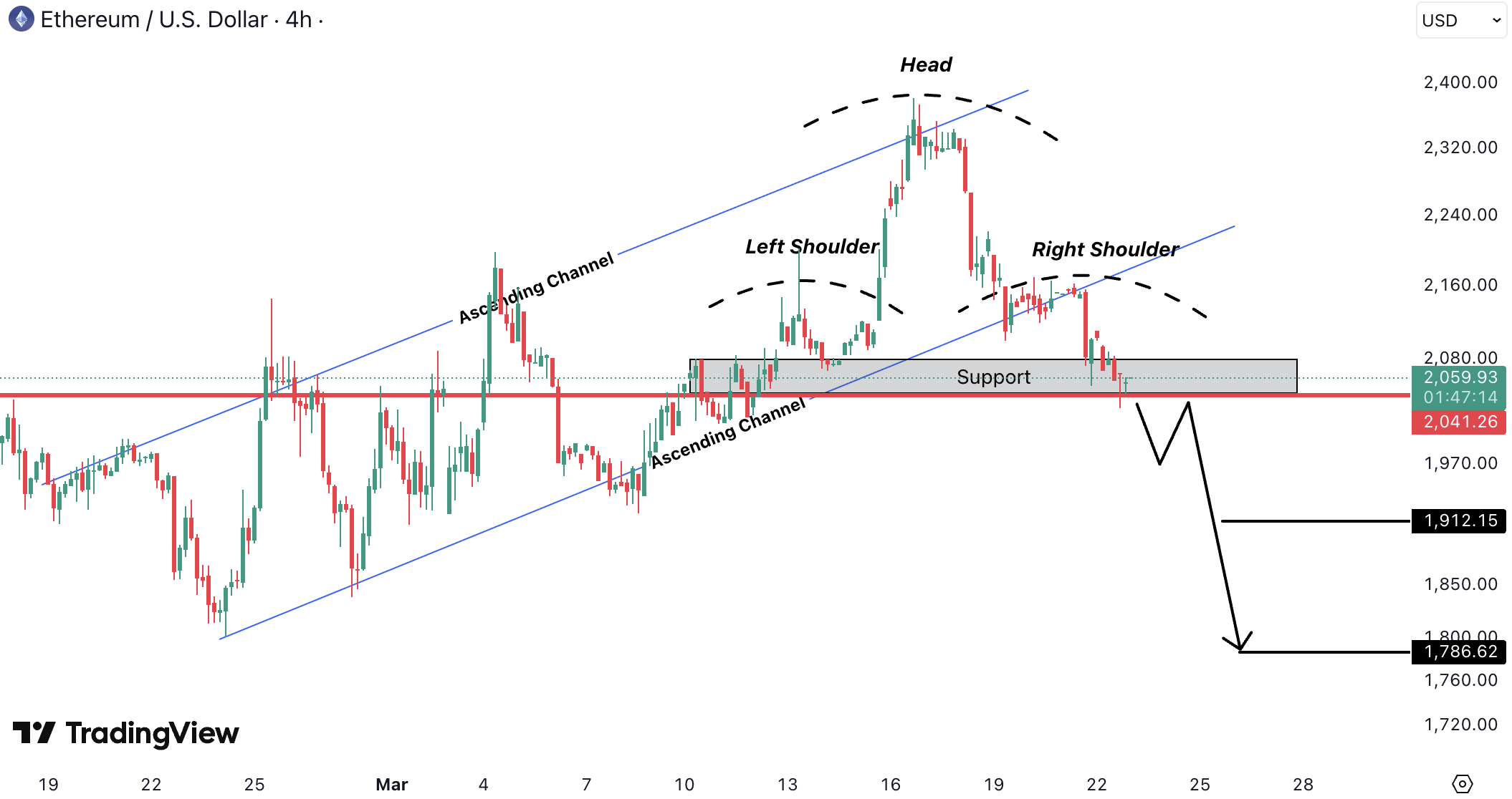 ETHUSD pe timeframe 4H formeaza un pattern clar de Head & Shoulders intr-un ascending channel, semnaland un posibil trend reversal dupa miscarea bullish recenta. Pretul a spart deja zona right shoulder si reactioneaza acum in zona de suport 2,040–2,060 USD (~1,880–1,900 EUR).