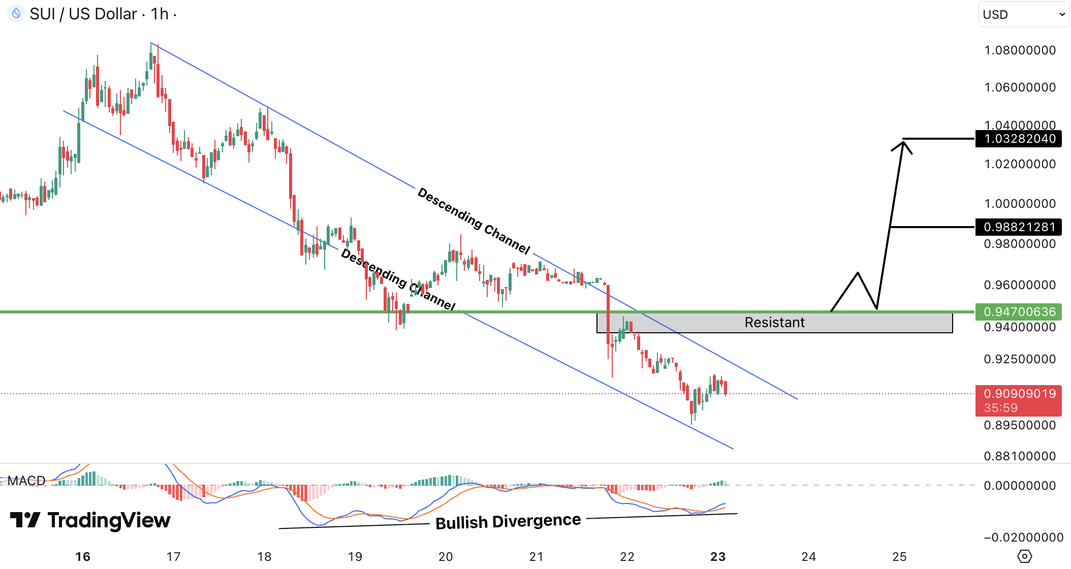 SUIUSD pe 1H se misca in continuare intr-un descending channel, dar momentumul pe downside slabeste, confirmat de bullish divergence pe MACD. Pretul este in jur de 0.90 USD (~0.83 EUR) si urca gradual catre rezistenta 0.947 USD (~0.87 EUR), un nivel cheie.