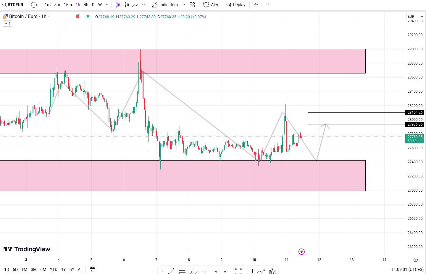 In timp ce faza de consolidare sugereaza o pauza temporara in actiunea preturilor, este esential sa privim in viitor si sa luam in considerare potentialele tinte de crestere. Pe baza analizei tehnice si a modelelor de pret istorice, BTC/EUR a identificat tinte promitatoare la nivelurile de 27,936 Euro si 28,104 Euro. Aceste niveluri indica zone potentiale de rezistenta in care pretul s-ar putea confrunta cu o presiune de vanzare.