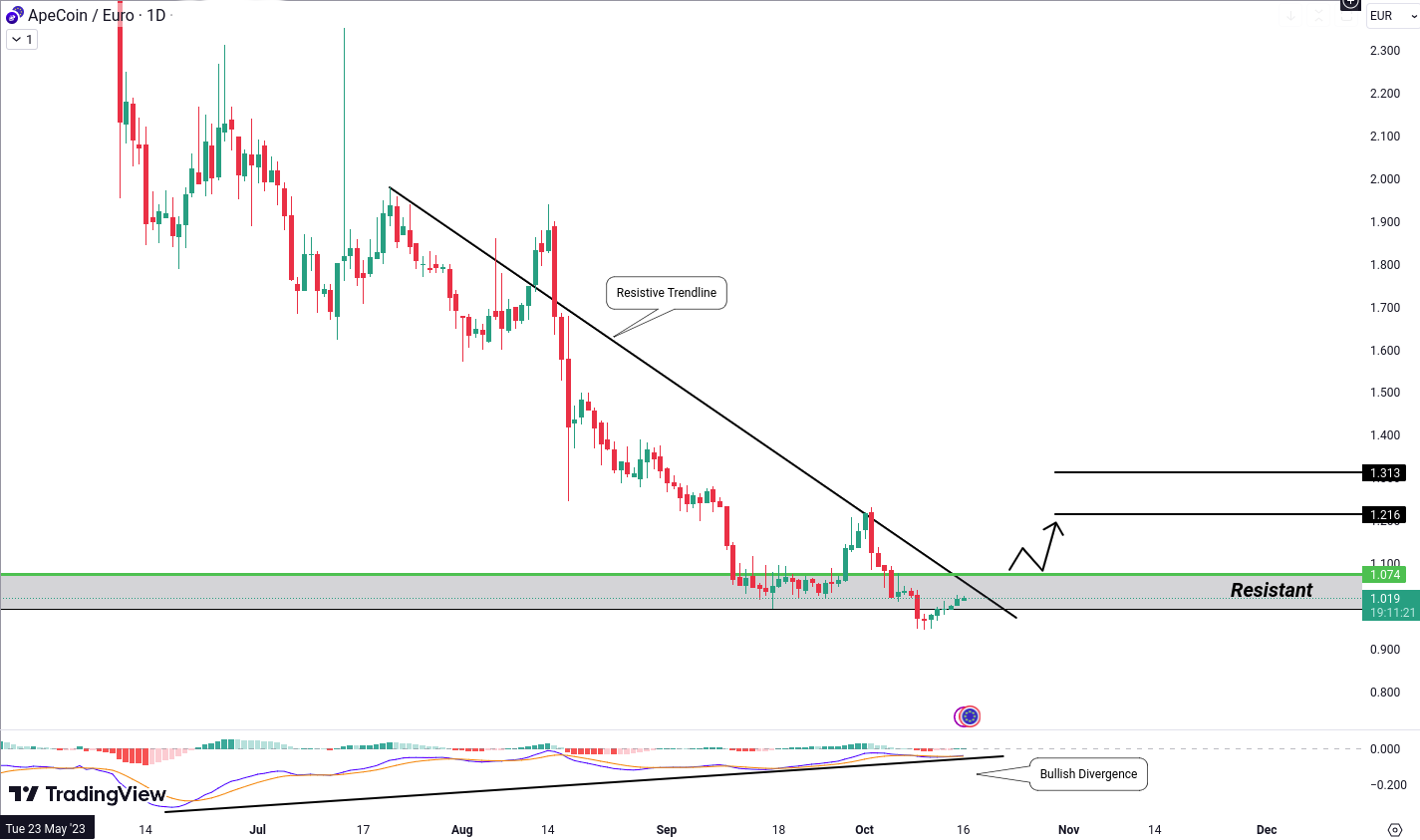 APE/EUR se afla in prezent intr-o tendinta bearish, urmand o linie de rezistenta. Cu toate acestea, a format recent o divergenta bullish pe MACD, sugerand o schimbare bullish iminenta. Pentru a captura aceasta posibila crestere, ar trebui sa monitorizam cu atentie o intrerupere peste nivelul de rezistenta de 1.074 Euro. O astfel de miscare deschide calea catre tinte in jur de 1.216 si 1.313 Euro.
