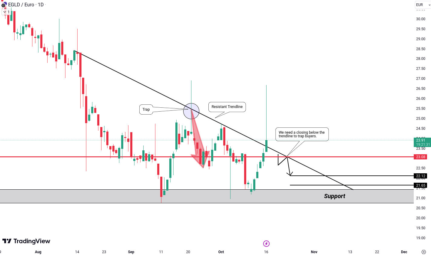 EGLD/EUR are o istorie de prindere a taurilor dupa ruperea liniei de rezistenta, iar se pare ca repeta acest model. Daca pretul scade sub linia de tendinta si se rupe la nivelul de 23.08 Euro, putem vedea o tendinta de vanzare. Prinderea taurilor ar putea duce la declansarea unui lant de ordine de stop-loss, indicand presiune de vanzare pe piata. In acest caz, tintele noastre proiectate sunt 22.12 si 21.65 Euro.