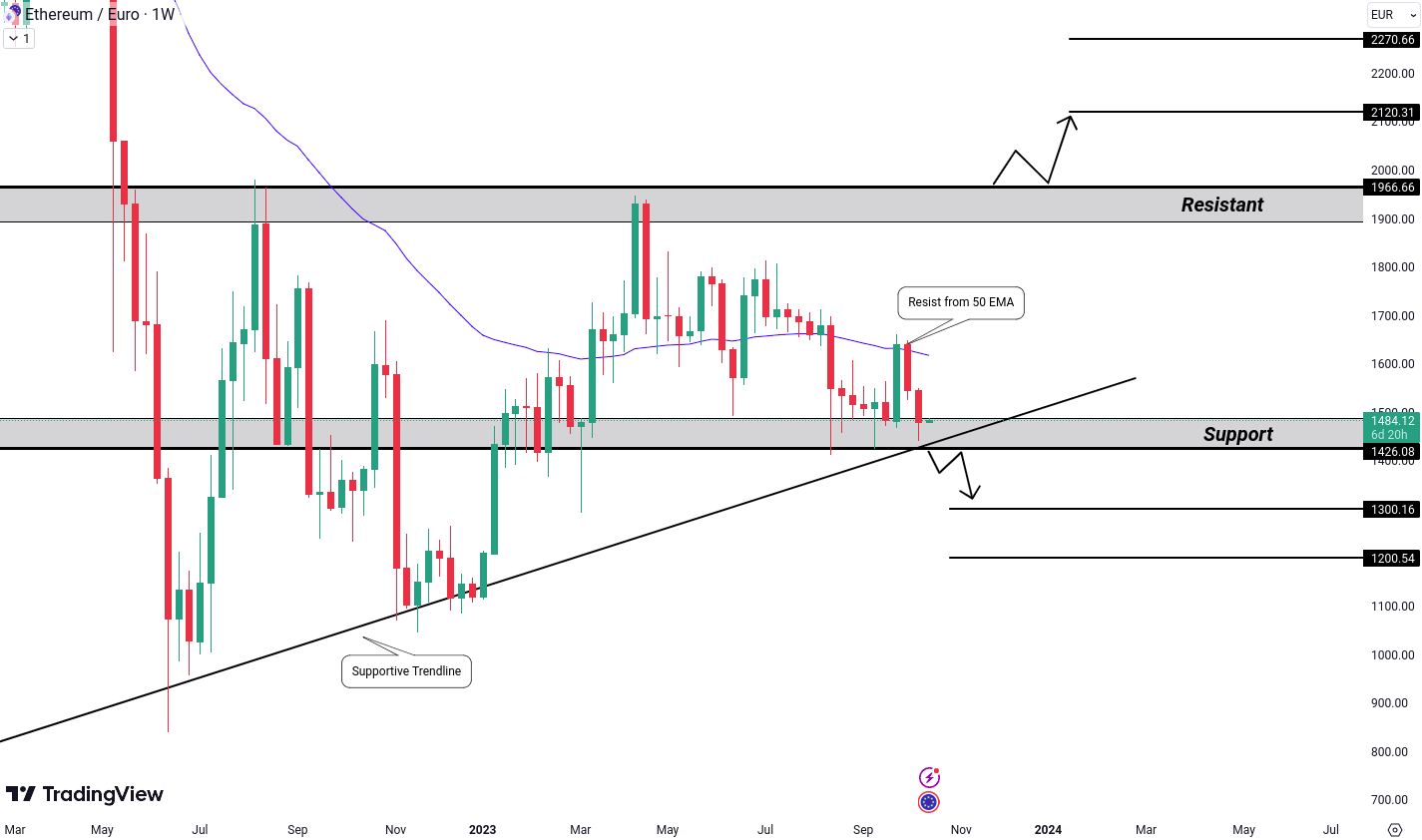 ETH/EUR a aratat recent respingere de la linia de medie mobila exponentiala de 50 de perioade (50 EMA), ceea ce a dus la consolidarea aproape de linia de tendinta de suport si nivelul de suport de 1426 Euro. Daca acest nivel este rupt, s-ar putea declansa vanzari panicate, ceea ce ar putea duce pretul sa atinga nivelele de 1300 si 1200 Euro.