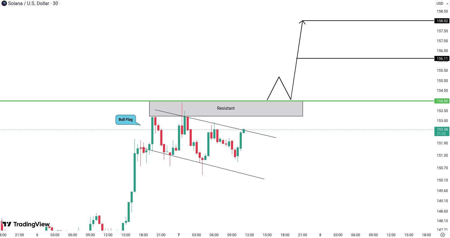 SOLUSD shows both technical and fundamental strength. It has formed a bull flag pattern, indicating potential for further bullish continuation.