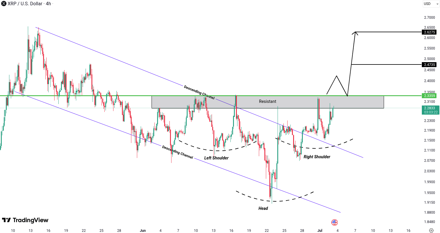 XRP has broken out of a descending channel and also formed an inverse Head and Shoulders pattern — both of which boost the probability of a bullish move. For confirmation, a breakout and candle close above the resistance zone at 2.33 USD is required. If this level is broken, we could see further upside toward 2.47 USD and 2.62 USD.