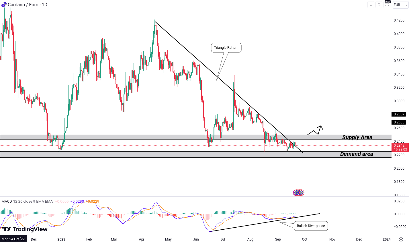 As it stands, the price is consolidating within the confines of the supply and demand areas. If it manages to break out above the supply area, specifically the 0.2507 Euro level, we could potentially set our sights on targets at 0.2688 Euro and 0.2807 Euro.