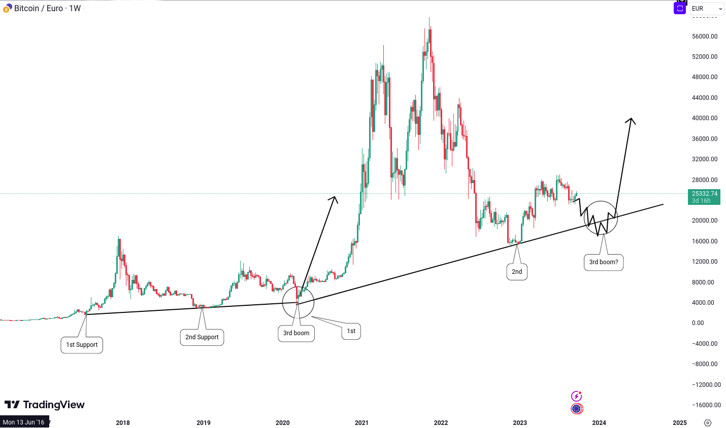 It seems like history might be repeating itself. BTC has found support at this trendline twice again recently, and I have a hunch that it might revisit this line in the coming days. If it does, and history holds, we could be in for a bullish ride, potentially reaching levels between 59,000 Euro and 65,000 Euro.