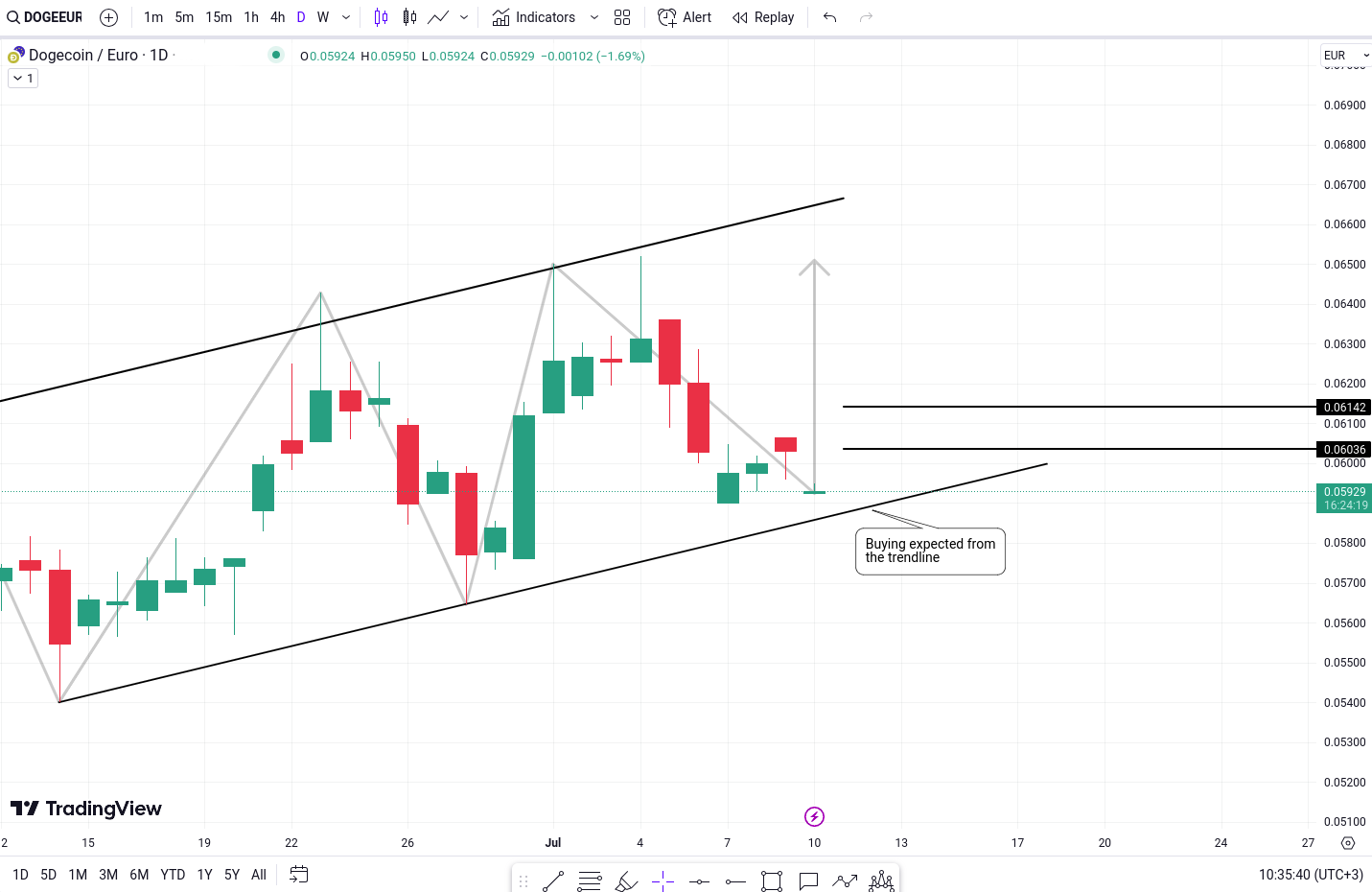 This confluence of factors has led traders to anticipate a potential bullish movement in DOGE, with projected targets set at 0.06036 Euro and 0.06142 Euro.