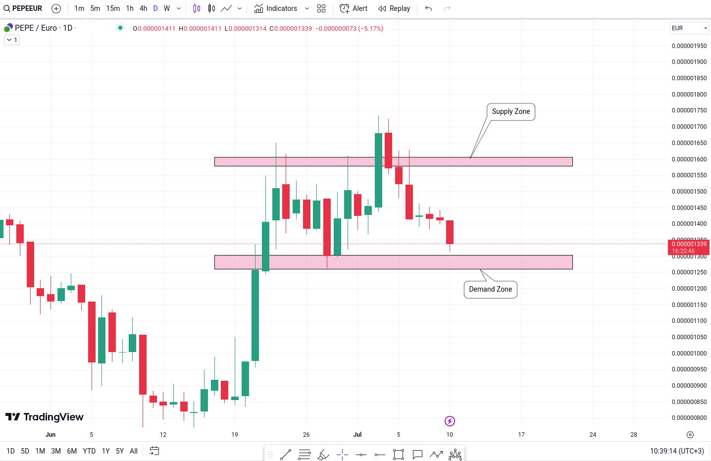 PEPE/EUR is currently positioned near a demand zone, which indicates the possibility of a bullish trend in the near future.