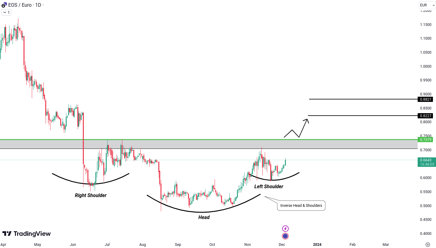 EOS/EUR has formed a bullish flag and pole pattern in the daily timeframe, a classic signal of trend continuation. Simultaneously, within this pattern, there’s the formation of a W pattern, adding to the bullish indications. For confirmation, a breakout above the resistance zone of 0.6575 Euro is eagerly awaited. Once this breakout occurs, it opens the door to potential targets at 0.6909 Euro and 0.7194 Euro.
