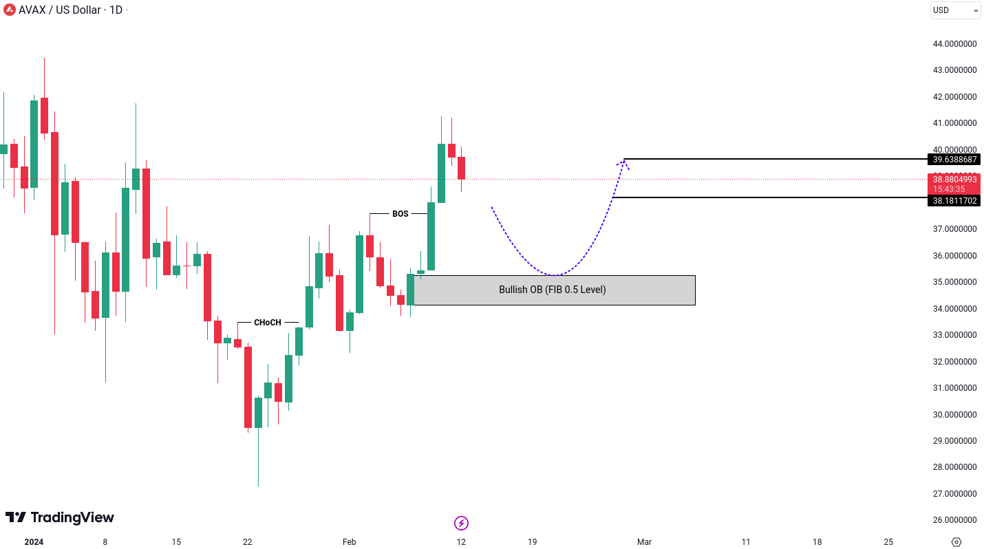 AVAX/USD is currently riding a bullish wave, showing signs of a significant change of character (CHoCH). After demonstrating a Break of Structure (BOS), indicating a shift in market sentiment, the bulls seem to have taken control of AVAX. With this newfound bullish momentum, we anticipate a potential bullish movement following a pullback, especially from the Bullish Order Block (OB) in the 34 to 35 USD zone. If this scenario unfolds, We could set sights on targets around 38.18 USD and 39.63 USD. Furthermore, if this bullish momentum coincides with the upcoming halving event, it could serve as a compelling reason to hold AVAX for the long term, because it’s surviving in the market from the previous bull run which showing its strength.