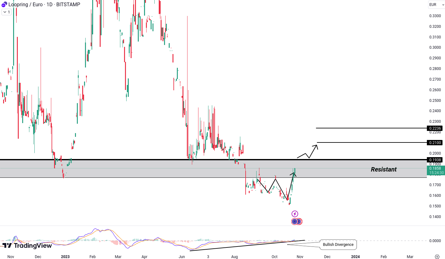 AXS/Euro is following a similar price action to LRC, forming a W pattern with bullish divergence. To potentially witness further bullish momentum, our focus lies on a breakthrough above the resistance level of 4.78 Euro. In the event of a successful breakout, our projected targets would be 5.15 and 5.42 Euro.