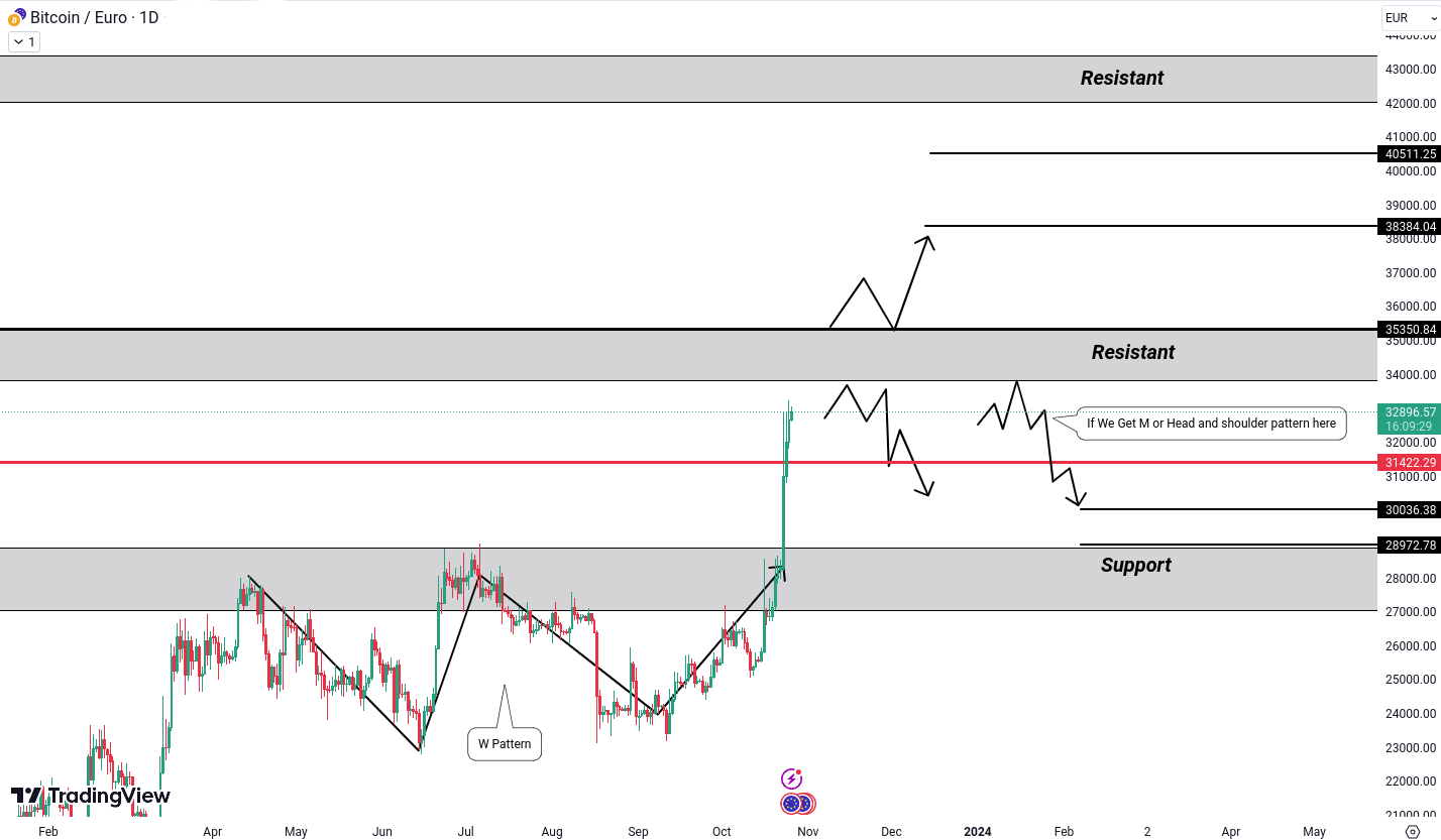 Our previous market analysis proved accurate, with BTC, ETH, GALA, and PEPE all hitting their respective targets. Notably, we captured a significant 22% gain in GALA within a single day, underscoring the power of technical analysis and price action. As we delve into today’s analysis, BTC/EUR is on track to hit our second target. For safe traders, securing 50% of their profits and setting their stop-loss at the breakeven point for safety might be prudent. Currently, BTC is approaching a resistance area, If the price breaks 35350 level then we can expect another potential bullish surge toward the 38384 and 40511 Euro levels, which is close to the psychological threshold of 40k Euro. To identify potential selling opportunities, we should look for the formation of an M or head and shoulder pattern, followed by a breakdown below the 31422 Euro level, potentially leading to targets at 30036 and 28972 Euro.