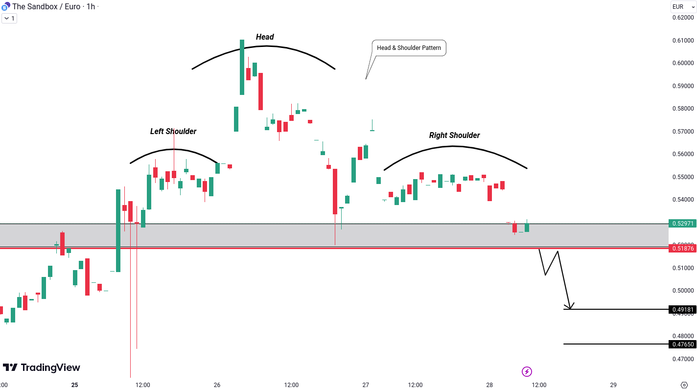 SAND/EUR is currently forming a head and shoulder pattern, a classic bearish reversal signal. This pattern, reflecting higher highs transforming into lower lows, suggests a potential change in trend. To confirm this bearish scenario, we are advised to closely monitor for a breakdown below the level of 0.51876 Euro.