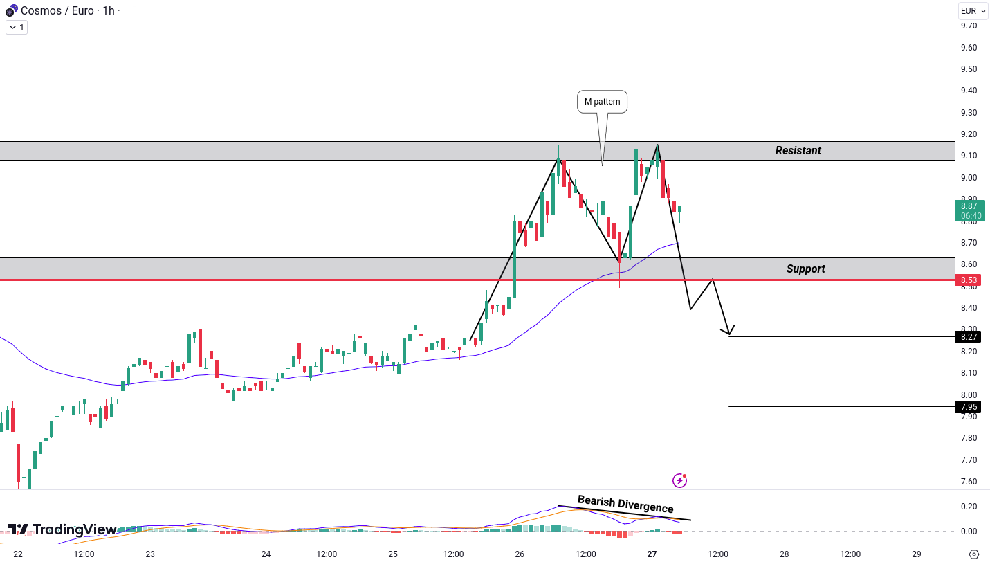 ATOM/EUR is currently forming an M pattern with a bearish divergence in the 1-hour timeframe, particularly at a resistant zone, signaling a bearish sentiment. To confirm this bearish outlook, we’ll be closely monitoring for a breakdown below the level of €8.53. If this occurs, our targets will be around €8.27 and €7.95.
