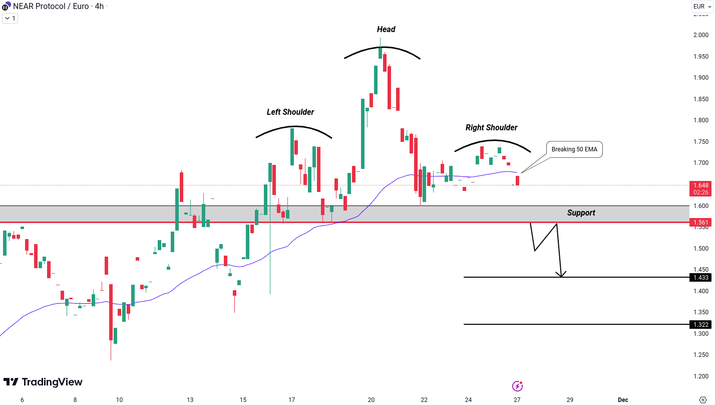NEAR/EUR is currently forming a head and shoulders pattern in the 4-hour timeframe & also breaks down the 50 EMA, which acted as support in the past. For confirmation of the head and shoulders pattern, we’ll be closely watching for a breakdown below the level of €1.561. If this occurs, our projected targets are €1.433 and €1.322 according to this pattern.