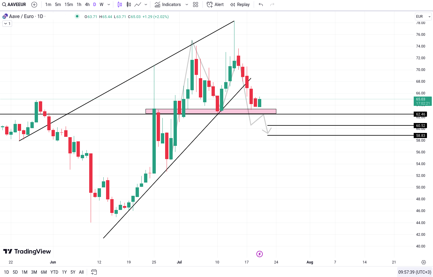 Spargerea recenta a modelului de tip “Rising Wedge” cu privire la AAVE/EUR semnaleaza posibile miscari bearish (descrescatoare) pentru pret. Traderii si investitorii ar trebui sa urmareasca indeaproape potentiala spargere si retestare a nivelului de 62.46 Euro, deoarece acest lucru ar putea confirma momentumul bearish.