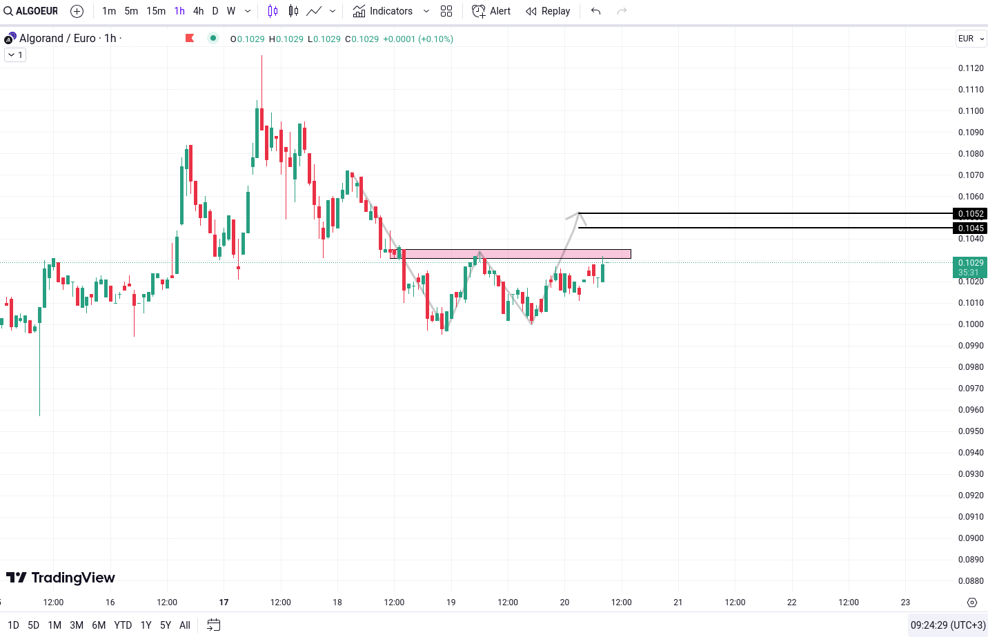 Algorand prezinta un model de tip W pe grafic, indicand potentialul unei inversari de trend in directia bullish. Investitorii cu experienta ar trebui sa monitorizeze indeaproape breakout-ul acestui model, deoarece acesta ar putea duce la obiective de pret de 0.1045 Euro si 0.1052 Euro.