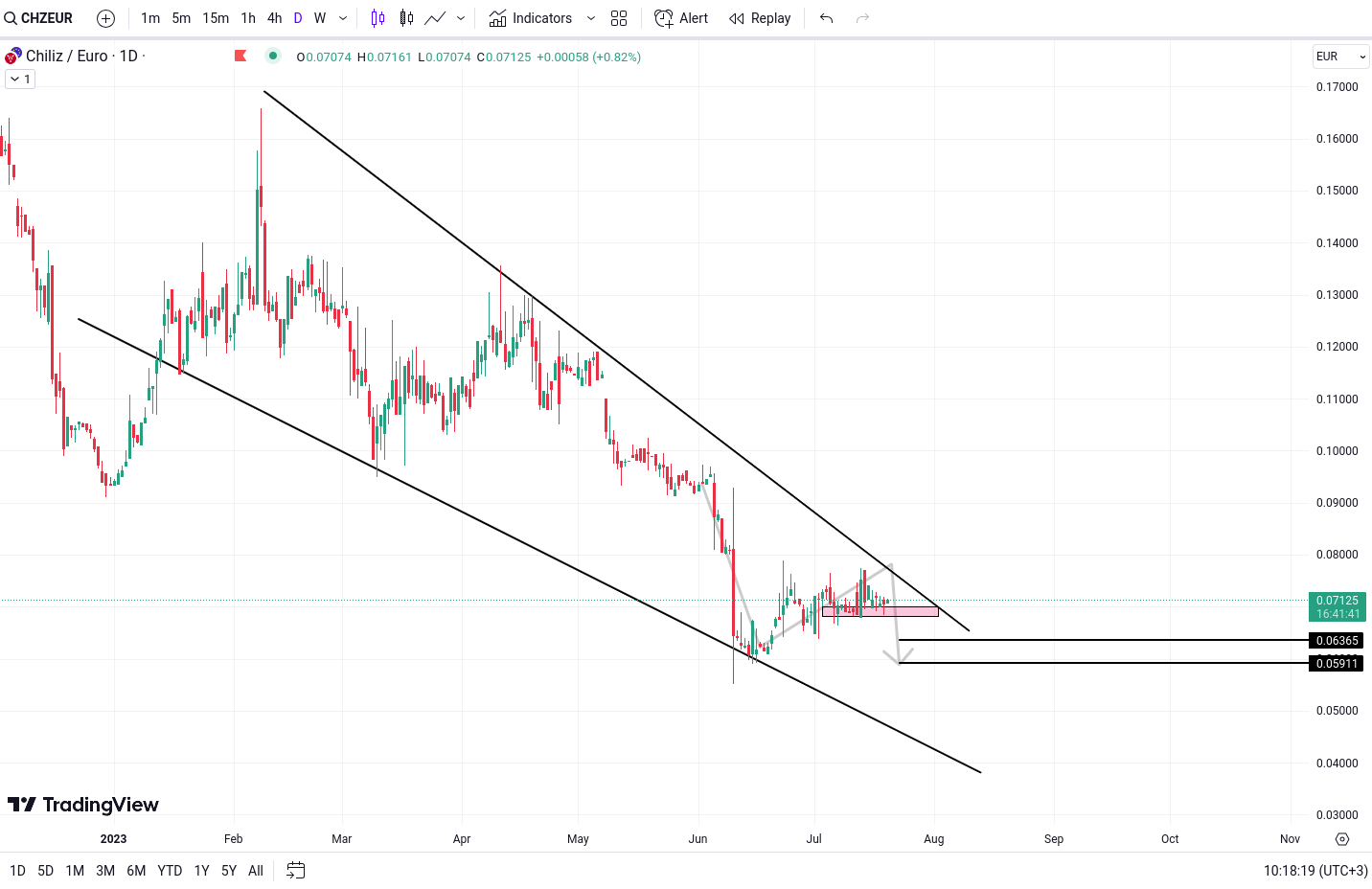 CHZ urmeaza in prezent un model de tip “Falling Wedge”, sugestiv pentru o posibila inversare a trendului in directie bearish (descrescatoare). Traderii si investitorii trebuie sa monitorizeze cu atentie nivelul critic de 0.06824 EUR, deoarece o spargere sub acest nivel ar putea declansa o miscare potentiala de scadere a pretului.