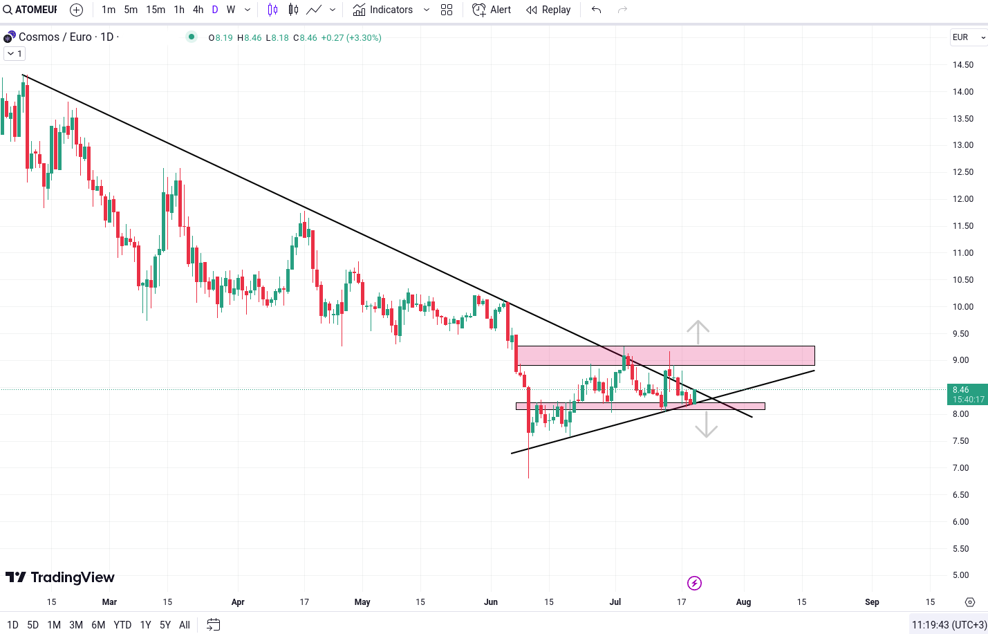 ATOM/EUR se afla in prezent in apropierea unei zone de cerere cruciale, ceea ce ridica posibilitatea unor miscari semnificative pe piata.