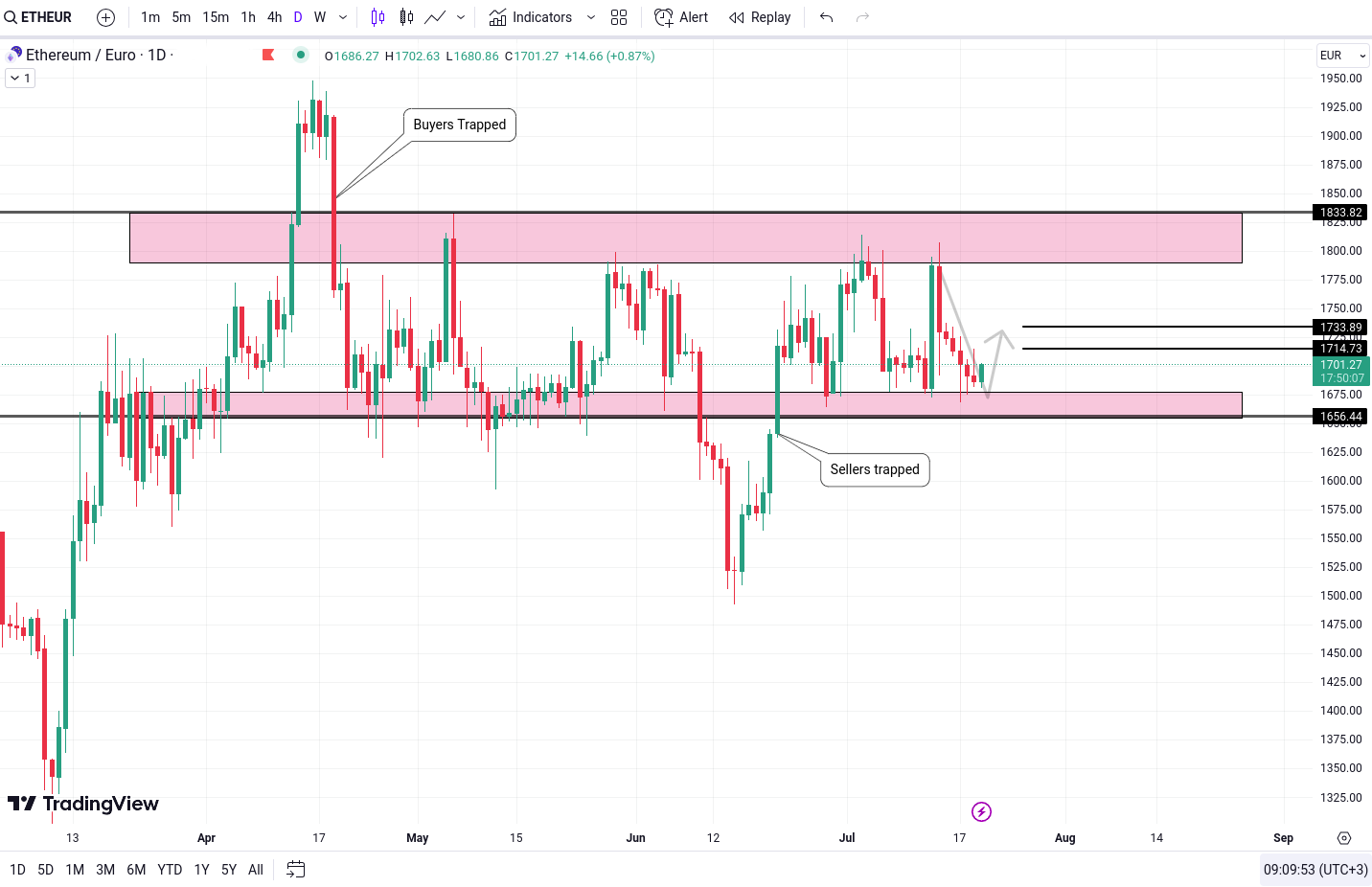In ceea ce priveste ETH, acesta se apropie de o zona critica de cerere, iar atat investitorii optimisti (bulls) cat si cei pesimisti (bears) sunt precauti in a face miscari semnificative. Cu toate acestea, avand in vedere suportul potential al zonei de 1,656 Euro, putem sa ne asteptam la tintele de 1,714 Euro si 1,733 Euro, iar sentimentul poate sa se indrepte catre partea optimista in urmatoarele zile.