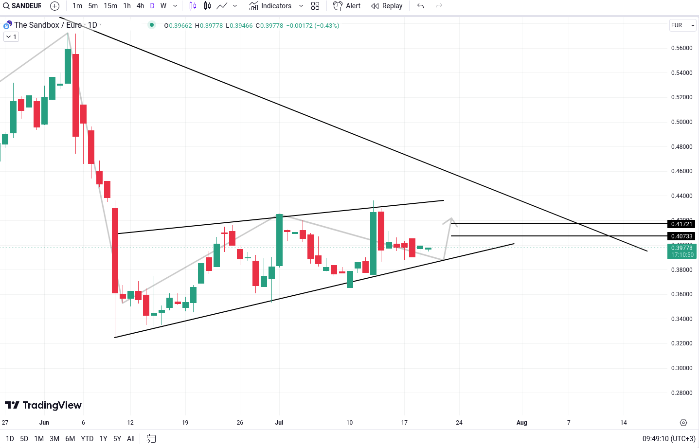 SAND urmeaza un model de tip “Rising Wedge”. Probabilitatea unei miscari bullish (ascendente) de la linia de trend inferioara este mai mare, mai ales luand in considerare linia de trend „magnet” deasupra modelului, care sporeste increderea in aceasta analiza.