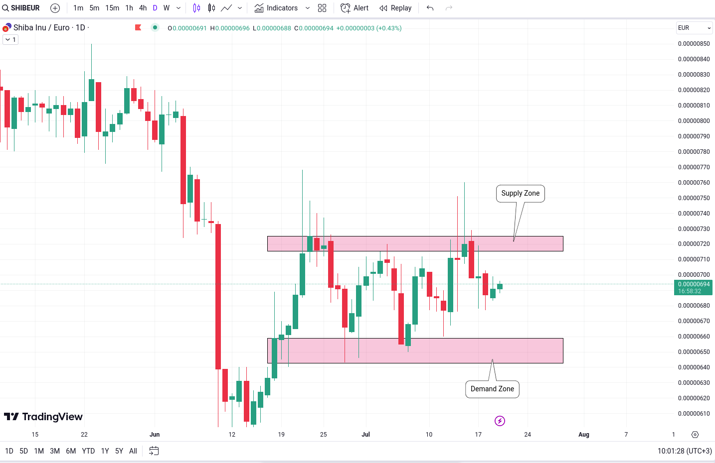 Pretul curent al SHIB se afla in mijlocul zonei de cerere si oferta, semnaland un potential echilibru intre cumparatori si vanzatori. Prin trasarea liniilor de trend si monitorizarea atenta a actiunii pretului, traderii pot identifica oportunitati de breakout.
