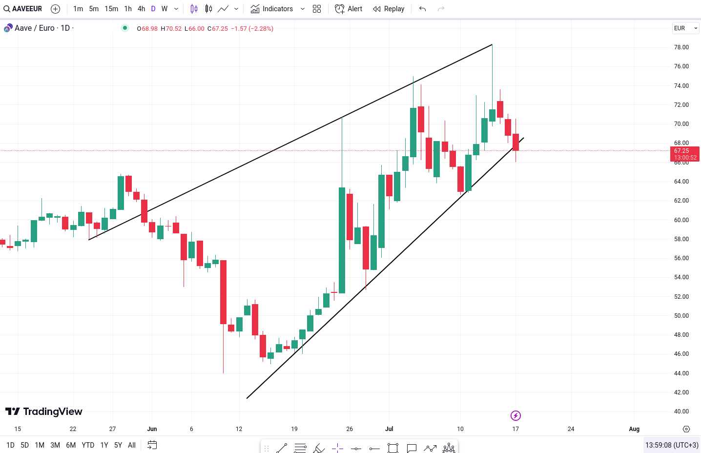 AAVE formeaza in prezent un model de tip rising wedge, care are potentialul de a semnala fie o spargere bearish, fie o inversare bullish de sub linia de trend inferioara.
