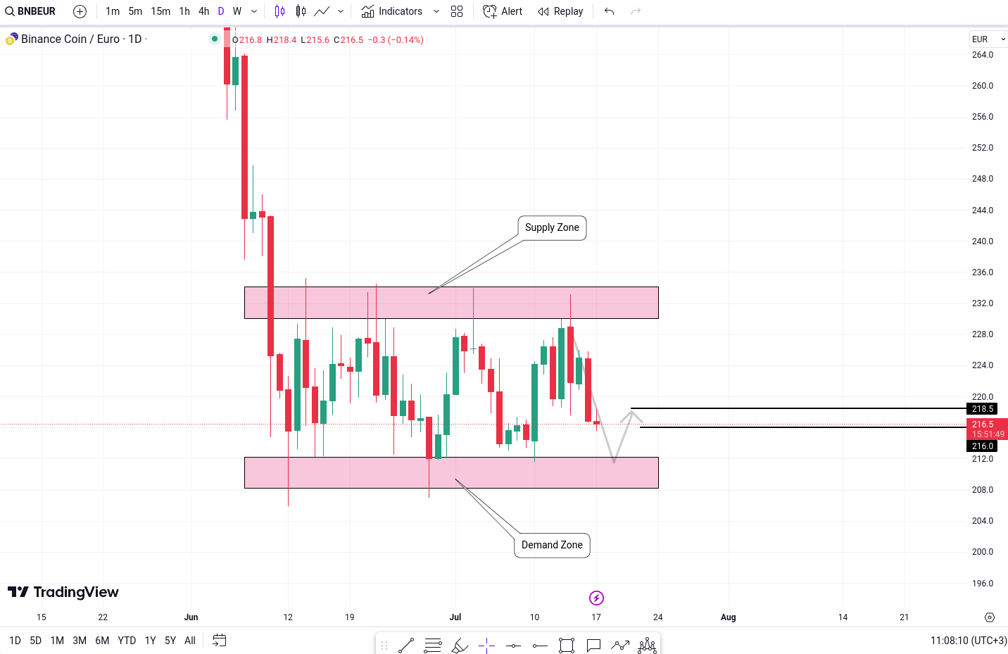 BNB/EUR se apropie de o zona semnificativa de cerere dupa o perioada prelungita de consolidare. Aceasta consolidare sugereaza ca piata asteapta un catalizator pentru a initia o miscare in tendinta.