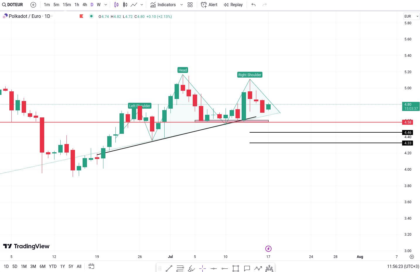 Pe graficul Polkadot (DOT), observam in prezent formarea unui model de tip „head and shoulders”, ceea ce sugereaza o miscare potential bearish in viitorul apropiat. Acest model tehnic este larg recunoscut si monitorizat cu atentie de catre traderi si analisti, deoarece adesea semnifica o inversare a tendintei de la bullish la bearish.