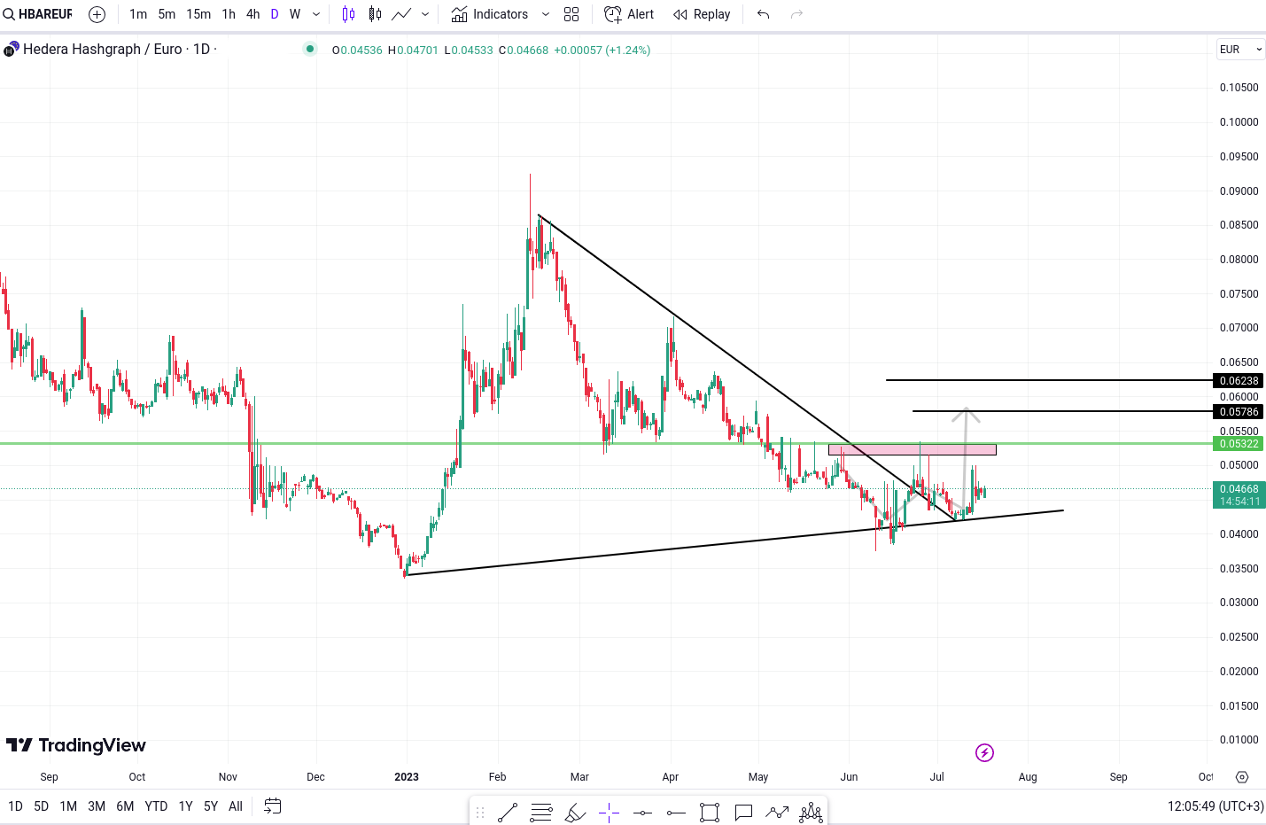 Hedera formeaza in prezent un model W in apropierea unei linii de trend semnificative, indicand potentialul unei spargeri ascendente. Traderii ar trebui sa urmareasca cu atentie o spargere peste nivelul de 0.05322 Euro, care ar confirma modelul si ar semnala o schimbare a sentimentului pietei.