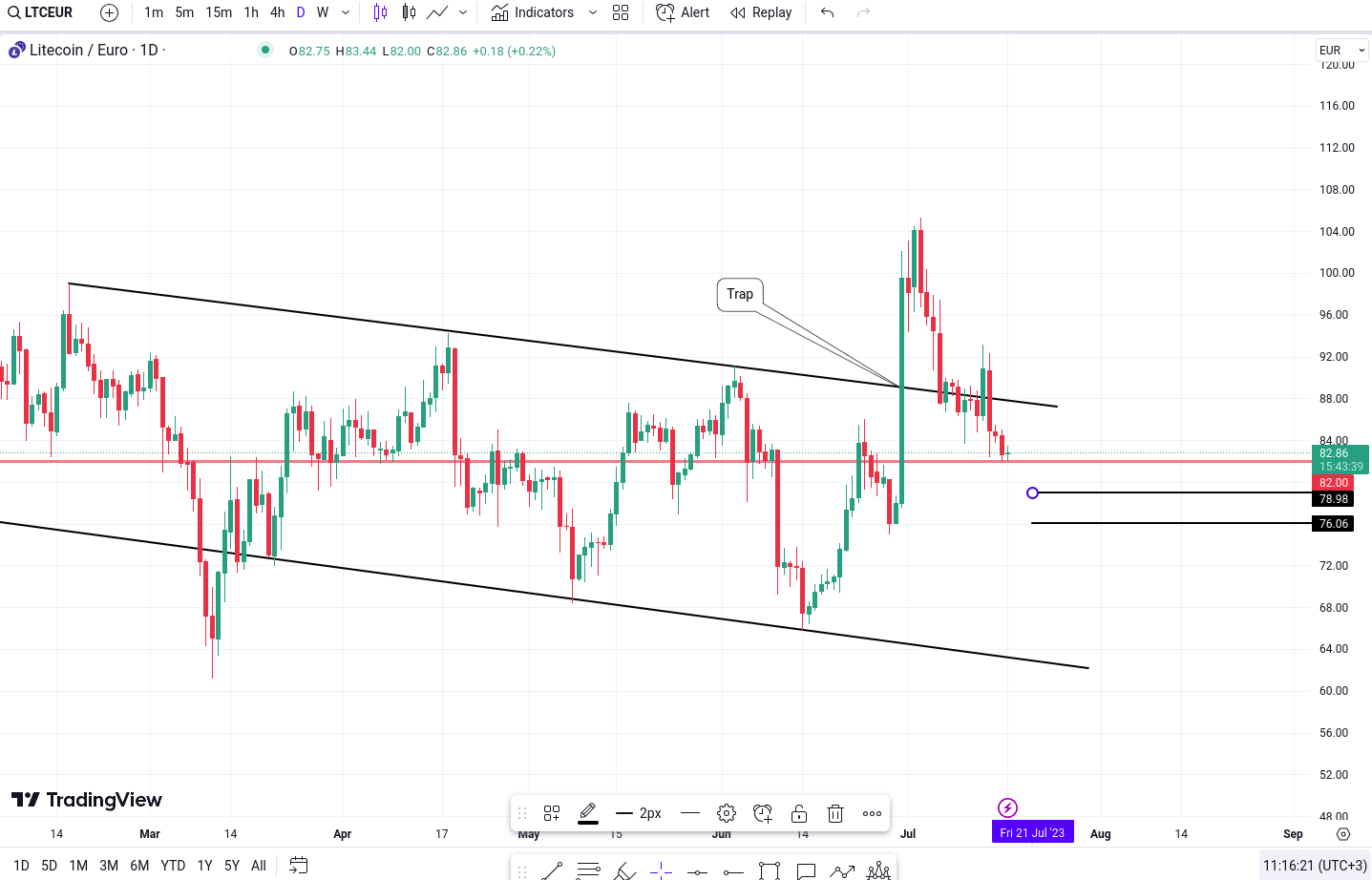 Formarea unui model de tip “Falling wedge” in ceea ce priveste LTC/EUR initial indica potentialul unei inversari ascendente. Cu toate acestea, actiunile recente ale pretului au dus la intoarcerea in model, capturand taurii si sugerand un sentiment bearish.