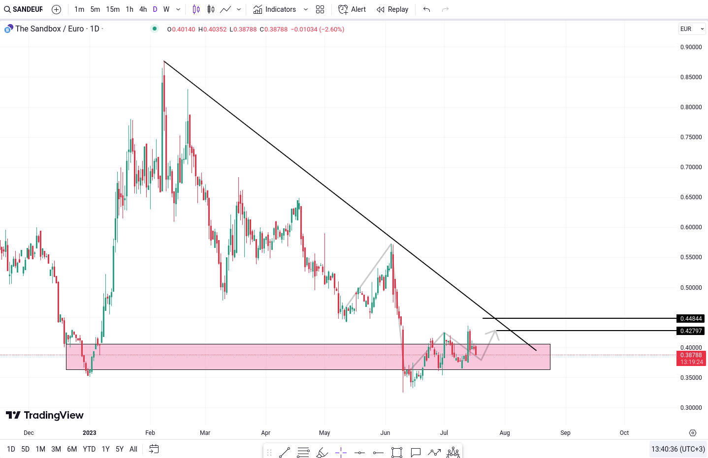 Pozitionarea SAND in apropierea unei zone semnificative de suport si urmeaza o linie de trend, sporind si mai mult importanta tehnica a acestei zone. Daca piata prezinta tendinta de crestere catre zona de suport, atunci putem sa ne asteptam la obiectivele potentiale de 0.42797 Euro si 0.44844 Euro.