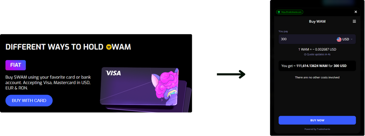 - Card integration: Enabled transactions using RON, EUR, and USD, ensuring users could purchase WAM tokens effortlessly.