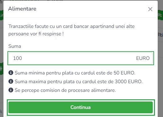 5. Introdu suma (la aceasta suma se aplica un comision pentru plata cu cardul) si apasa pe butonul Continua: