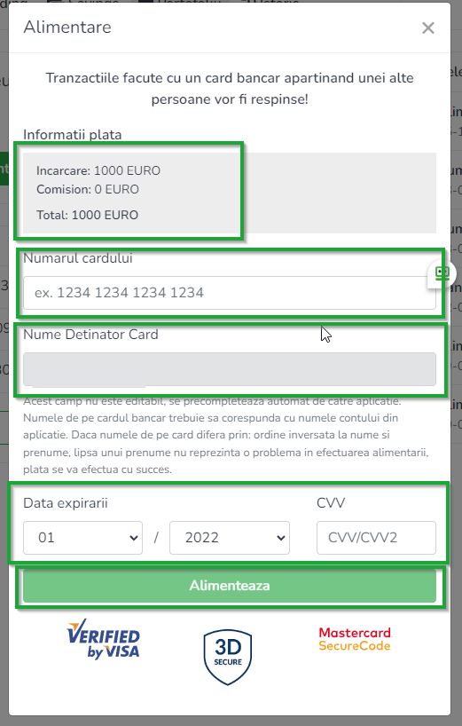 6. Indrodu datele cardului tau bancar (Tradesilvania nu stocheaza datele tale bancare) si apasa pe butonul Alimenteaza:
