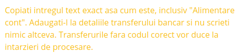 Dupa ce ai introdus suma si ai apasat pe butonul Alimentare o sa vezi informatiile pentru transfer bancar.