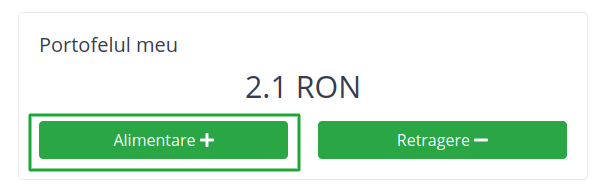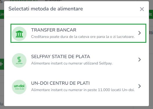 Alimentarea portofelului de EURO sau RON prin transfer bancar se face din sectiunea Portofoliu.