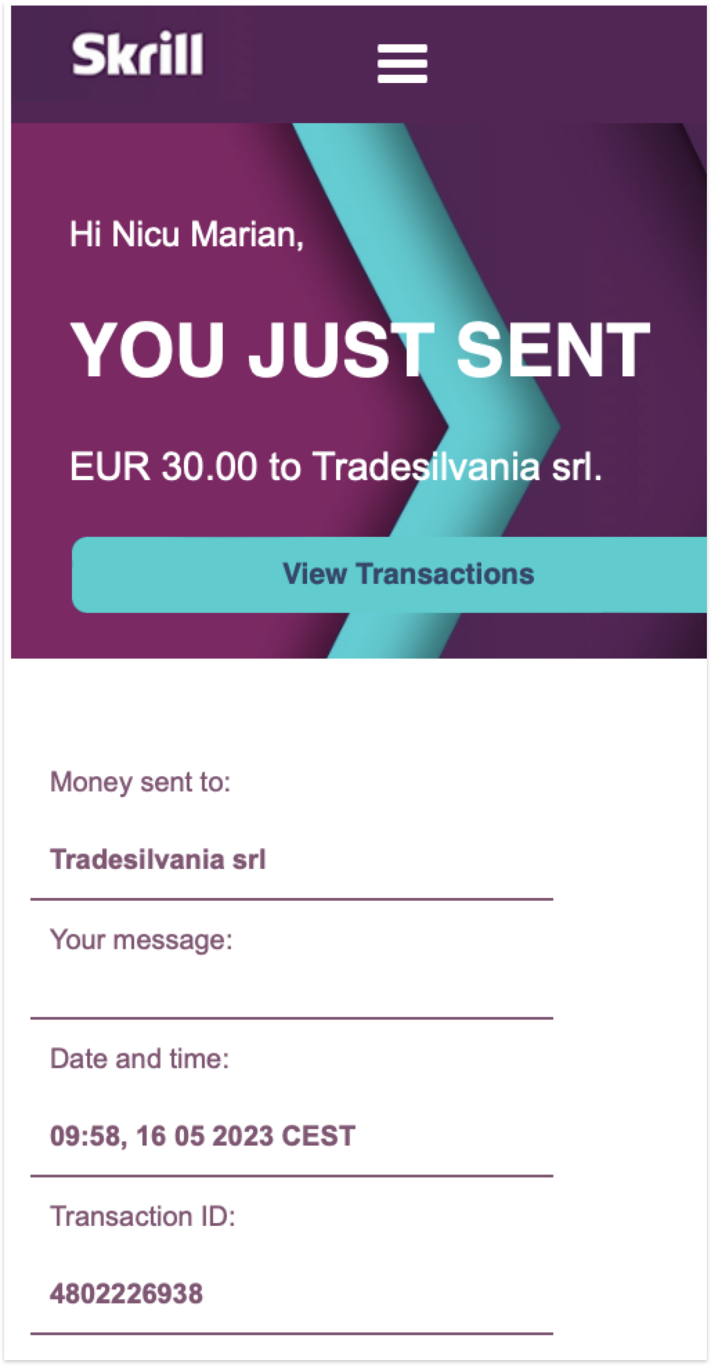 10. In contul Skrill este afisata confirmarea transferului catre Tradesilvania