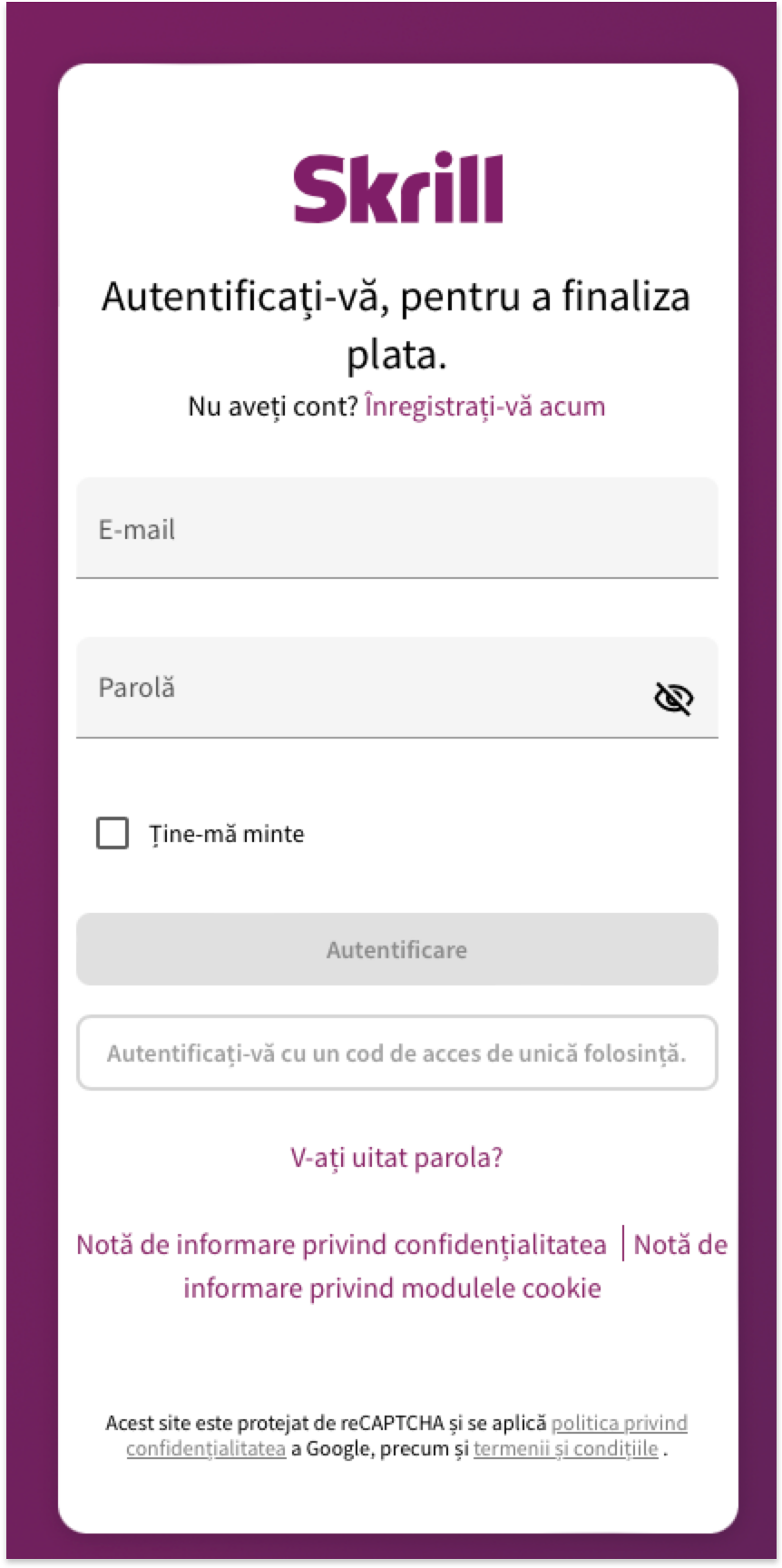 6. Vei fi redirectat pe pagina de confirmare Skrill pentru finalizarea transferului.