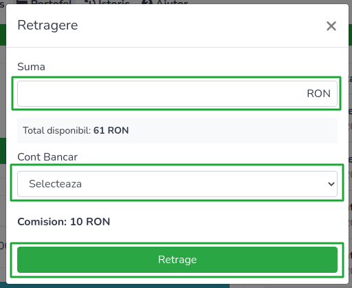 Inainte de a efectua o retragere catre contul tau bancar trebuie sa te asiguri ca ai un cont bancar in aplicatie. Daca nu ai nici un cont bancar activ in aplicatie citeste sectiunea Cum adaug un cont bancar ?.